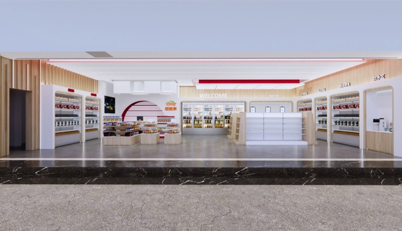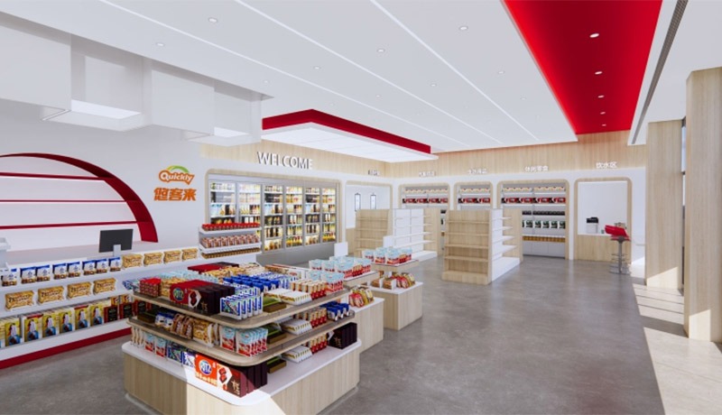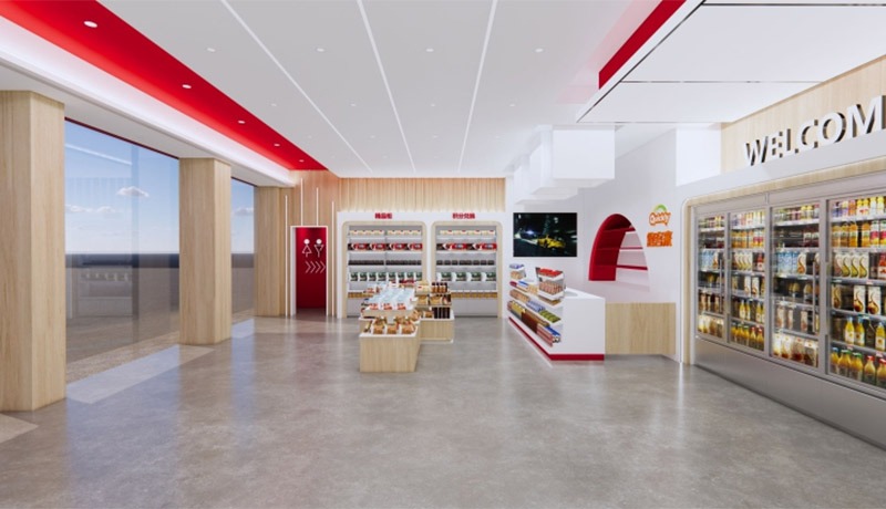Inside the convenience store, every detail is tailored to improve the customer journey. The layout is optimized for smooth traffic flow, with high-demand products placed in accessible locations. Branded graphics, coordinated color schemes, and customized shelving create an inviting atmosphere that encourages longer dwell times and increased sales. The store also incorporates energy-efficient lighting and durable, easy-to-maintain materials, aligning with modern sustainability standards.
