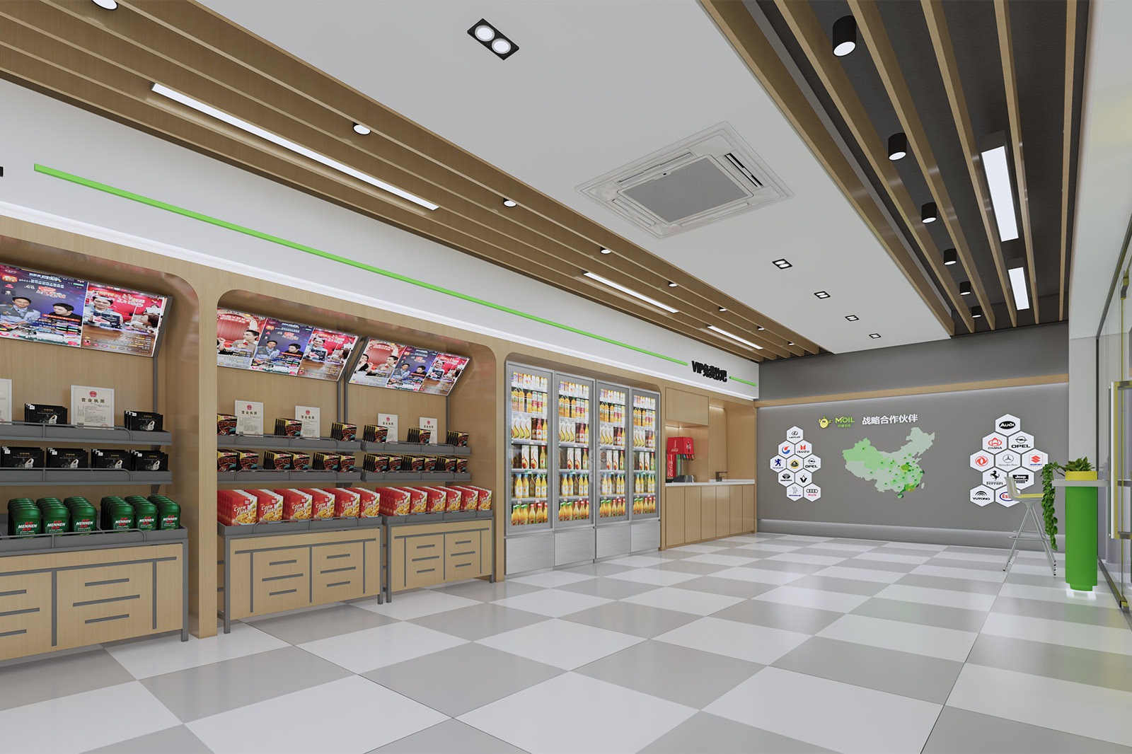 Green elements represent the brand’s commitment to sustainability. Inspired by the Chaoshan people’s commitment to protecting their local ecology, the green lines within the station resemble natural veins, connecting environmental protection concepts with technological services.